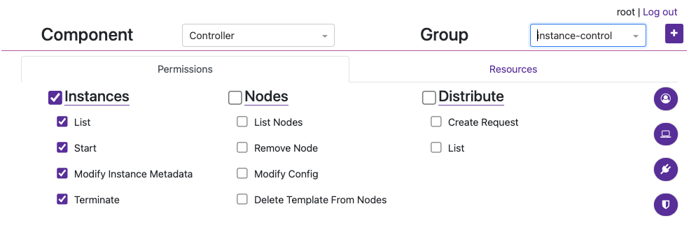 2. You can now target and add specific Permissions or Resources for the Group. Click the circular (💻) icon on the right to highlight what permission should be set for Nodes to communicate with the Controller. Then check/enable the highlighted permissions and click Save Permissions at the bottom of the page. Important: Finally, do the same but under the Registry Component.