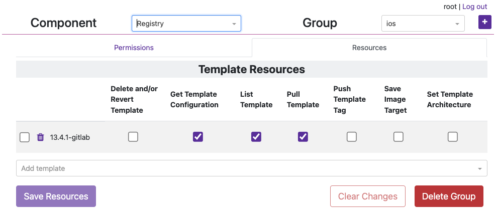 2. Under the ios Group > Resources, add the Template Resource you want this team to access. The bare minimum permissions are seen in the image below.