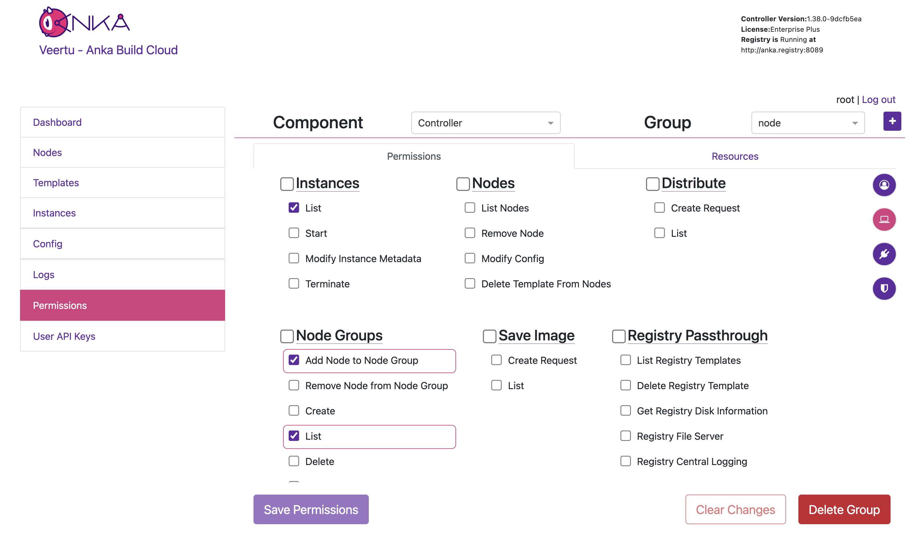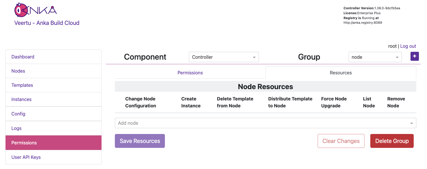 In the previous section on Group Permissions, we joined a Node using a credential with the Group node attached. This Group only has Permissions to perform the minimum required actions to run as an Anka Node and communicate with the Controller. We did not add Resources to it though (even though we technically could) so we can instead have team specific Groups and credentials.